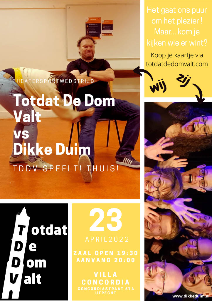 Hoe leuk zou het zijn als je iets bedenkt wat vervolgens ook meteen voor je ogen gebeurt? Bij improvisatietheater kan het. En op zondag 29 januari kan jij het meemaken. Totdat De Dom Valt speelt dan een kindervoorstelling. Er worden ter plekke allemaal korte scènes bedacht. Wat dan? Dat bedenk jij.. Op de maan of in de jungle, als superheld, of als zangeres… met superheldenkracht… Of… iets héél anders. En je mag ook nog meedoen… als je durft.