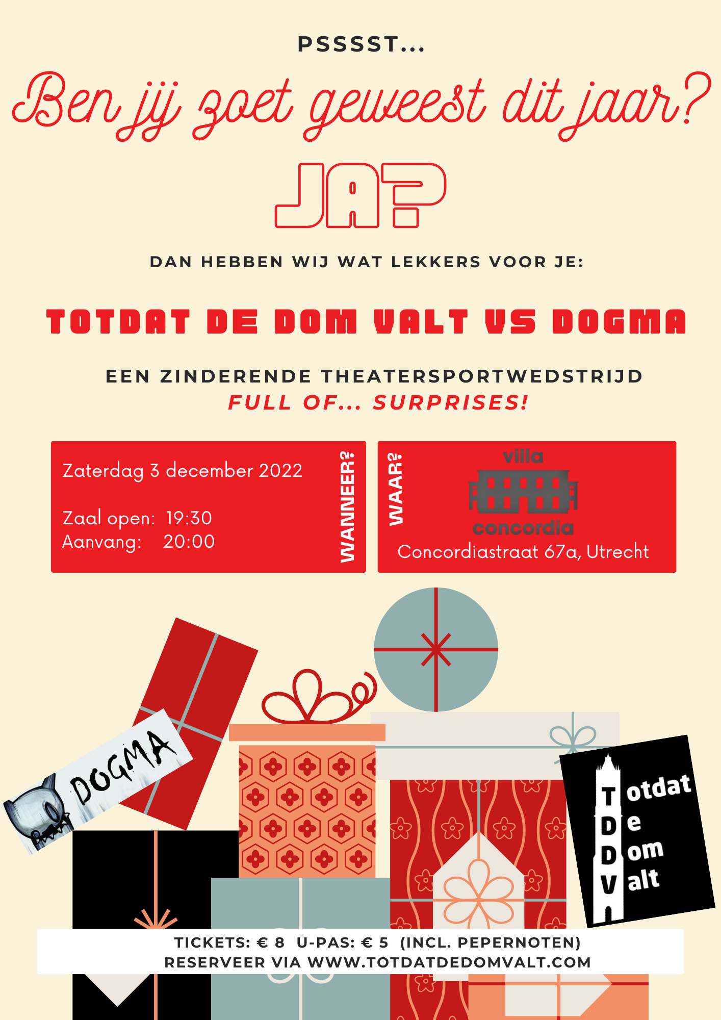Wat: Kindervoorstelling Totdat De Dom Valt Datum: Zondag 29 januari 2023 Tijd: 13.00 uur en 15:00 uur Locatie: Villa Concordia, Concordiastraat 67 a, Utrecht Entree: Volwassenen: 8 euro / Kinderen t/ m 16jaar: 5 euro / Familie (2 volwassenen en 2 kinderen): 20 euro (reserveer 4 kaartjes, korting wordt aan de kassa verrekend)